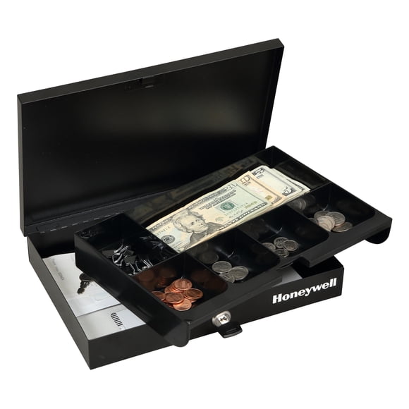 Honeywell Low Profile Steel Cash Box with Key Lock, Removable Tray, i Bill and 5 Coin Slots